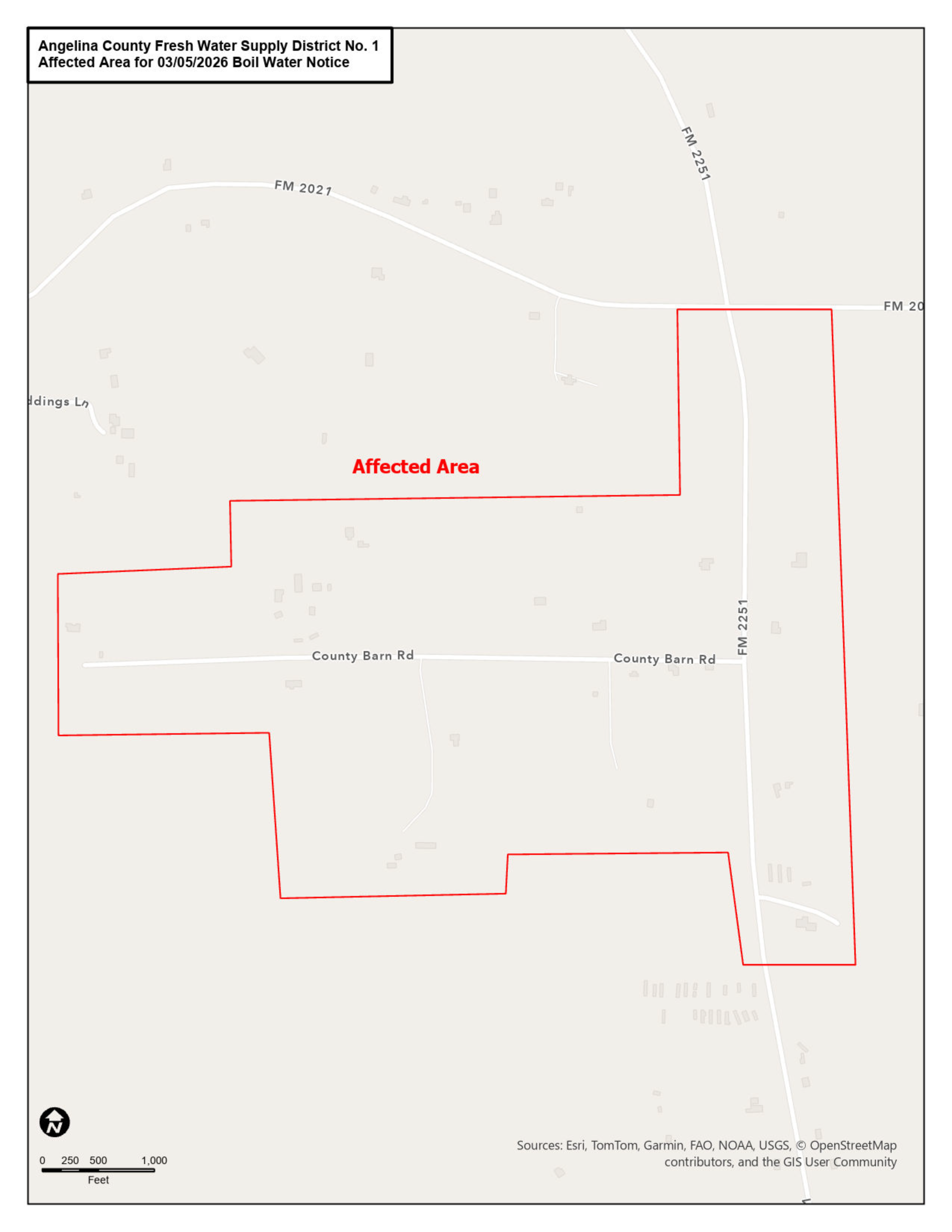 On March 05, 2026, the Texas Commission on Environmental Quality (TCEQ) required the Angelina County FWSD No. 1 public water system (PWS ID Number 0030102) to issue a Boil Water Notice to inform customers, individuals, or employees that due to conditions which occurred recently in the public water system, the water from this public water system was required to be boiled prior to use for drinking water or human consumption purposes.
